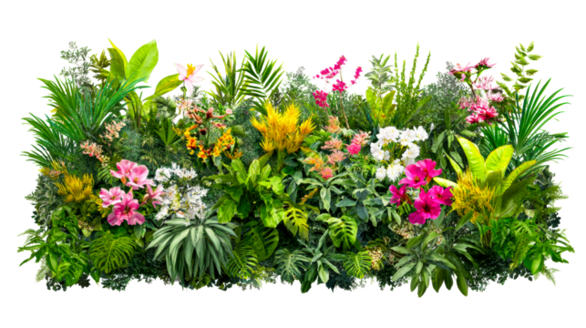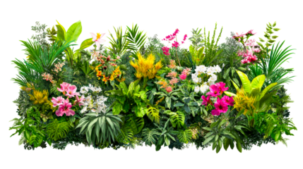 Abundant Tropical Foliage and Vibrant Pink and Yellow Flowers Displayed Against a White Background, cut out transparent