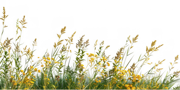 Vibrant yellow flowers bloom over lush green grass in a sunny outdoor setting during springtime isolated on transparent background