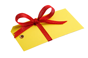 A bright yellow gift tag with a vibrant red satin ribbon tied in a neat bow for special occasions and celebrations isolated on transparent background