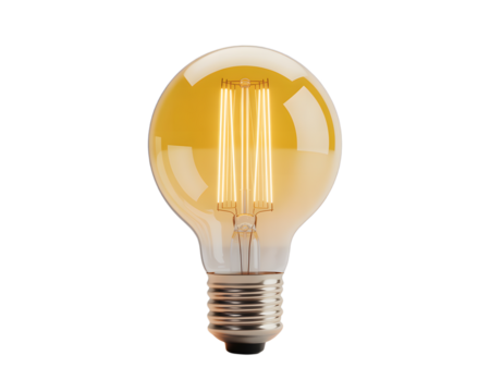 A single glowing light bulb with wire, soft yellow glow, transparent background for design use.