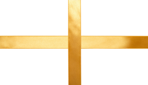 Cut out image of golden satin cross-stretch ribbons. Glossy silk yellow ribbons for holiday gift box isolated on transparent background.