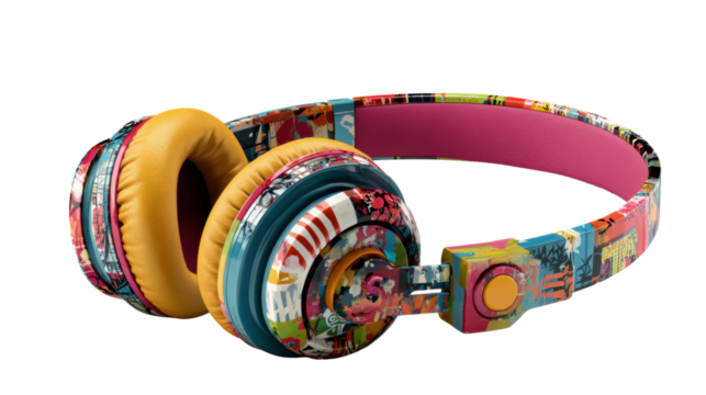 Headphones showing colorful street art, conveying sound, audio, and urban style. Isolated on transparent background