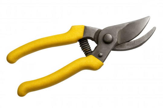 Sharp gardening secateurs with yellow handles isolated on transparent background, ready for pruning and trimming tasks