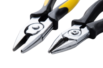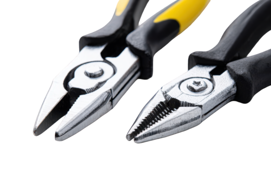 Close Up of Two Metal Pliers with Black and Yellow Handles on Transparent Background