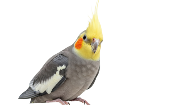 A cockatiel with yellow head and gray body perched against a black background looking at the camera