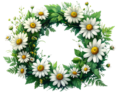 Firefly_Cartoon style floral wreath of wild daisies, monochrome green, transparent background
