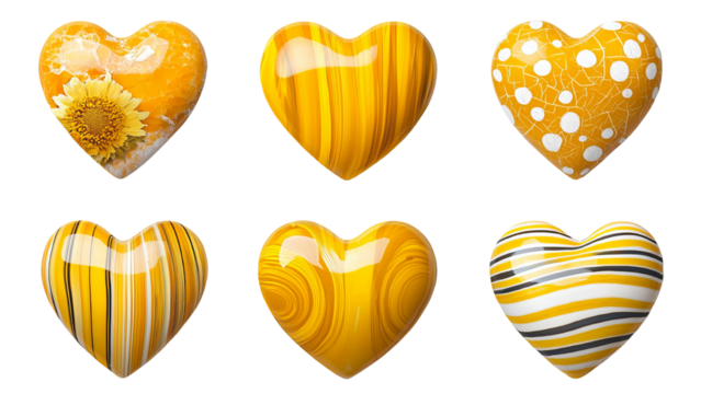 Png of Six vibrant yellow hearts in varying textures and patterns, perfect for expressing warmth and joy on transparent background.