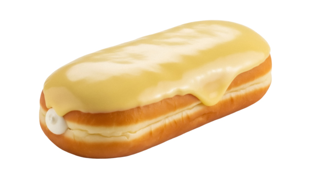 Long John donut with custard filling isolated PNG, delicious pastry with yellow icing on transparent background for bakery and dessert concepts