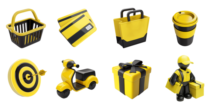 Shopping 3d style yellow icon set. Basket, gift, credit card, coffee cup, scooter, target, delivery man 3d icon.
