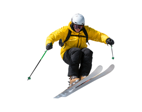 Young woman in a yellow jacket with a backpack, standing against a white background, ready for adventure and outdoor exploration.