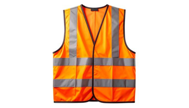 bright orange safety vest with yellow reflective stripes for workers or cyclists isolated on solid white background in Png