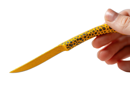 Close-up of a yellow knife with a speckled handle