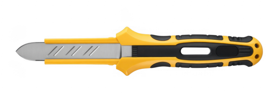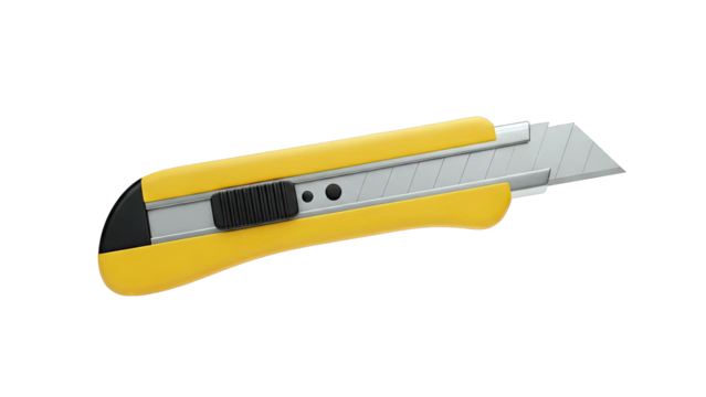 Yellow and black utility knife with silver blade and ergonomic grip isolated on a transparent background