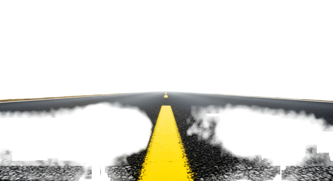 Asphalt road with a single yellow line isolated on a transparent background