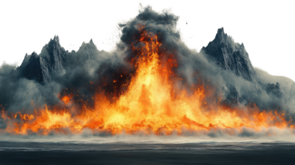 Blazing firestorm engulfing the forest and mountains with intense flames and smoke under a dark night sky
