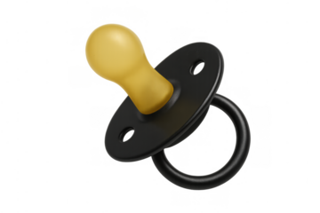 Baby pacifier with yellow nipple and black shield providing comfort and soothing infants during childhood on transparent background