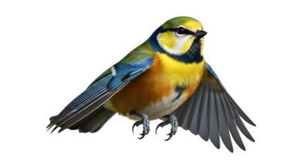 Isolated Eurasian Blue Tit with yellow, blue, and green plumage, perched and poised to fly