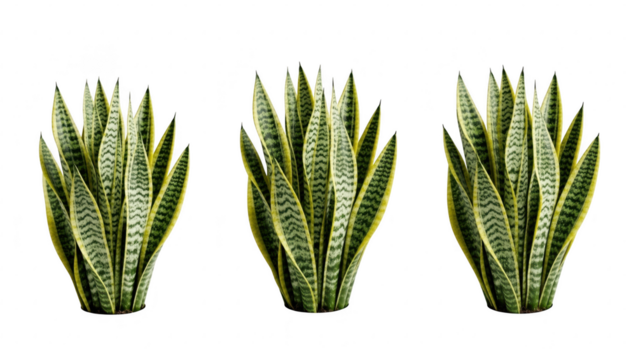 Three vibrant snake plants with distinctive yellow-edged leaves and green patterns isolated on transparent background