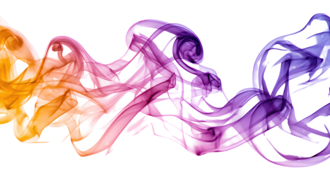 An abstract vibrant smoke wave with a colorful gradient from orange to purple on a black background isolated on transparent background