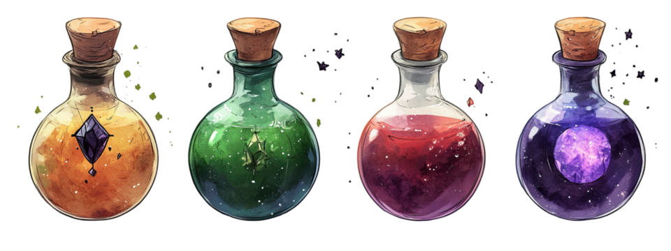 Four potions with different colors and contents, each corked