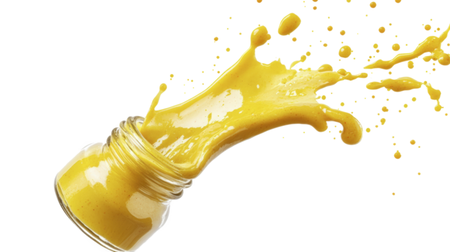 A glass jar of yellow paint tipped over, splashing its contents energetically against a white background.