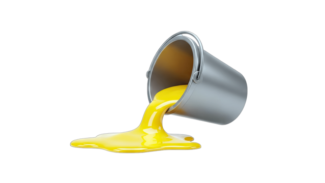 spilled paint bucket with vibrant yellow paint flowing out, creating colorful mess. bright colors evoke creativity and artistic expression