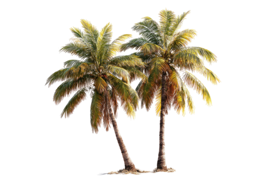 Two lush green and yellow tropical palm trees with multiple slender trunks and vibrant fronds, isolated on transparent background