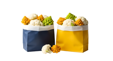 Fresh colorful cauliflower and Romanesco broccoli in blue and yellow paper bags isolated on black background, healthy vegetable snack or food market concept