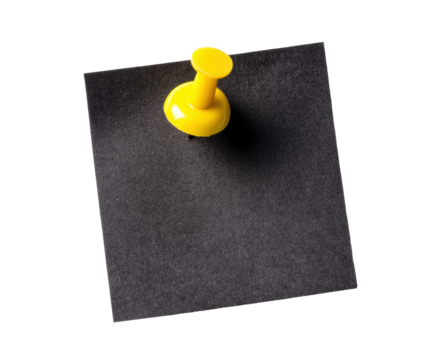 Bright yellow pin attached to a black note for organization, cut out transparent