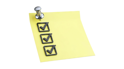 A single yellow sticky note pinned to a surface isolated on transparent background