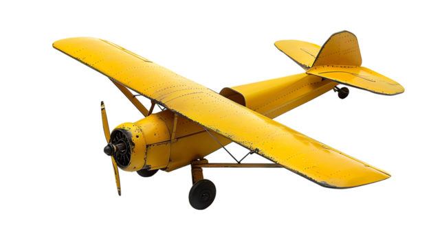 Joyful boy playing with toy plane in pilot goggles on transparent background