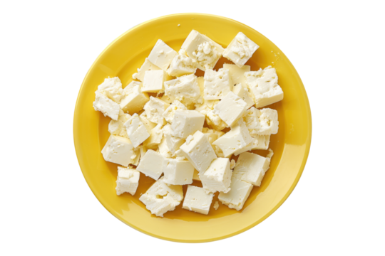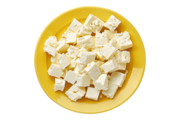 Feta cheese on a yellow plate on a transparent background. isolated background.