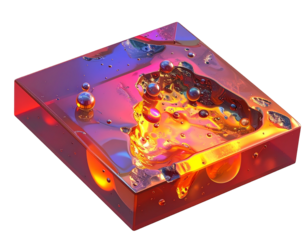 A translucent cube with abstract, colorful liquids and spheres inside