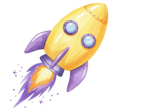 Isolated yellow rocket ship watercolor painting for kids education and space learning