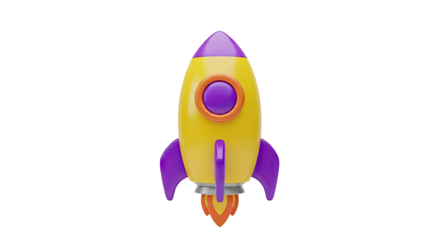 Blue childrens backpack with yellow trim and a rocket patch, isolated on transparent background