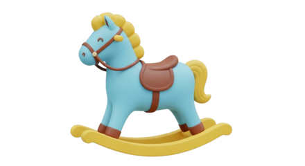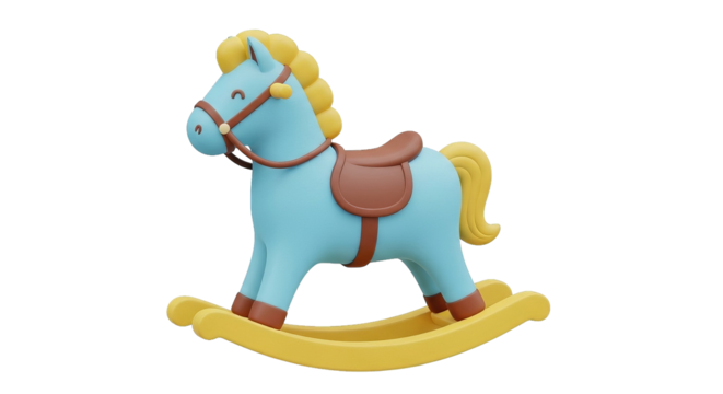 A charming light blue and yellow rocking horse with saddle, rendered in a smooth, cartoonish style.