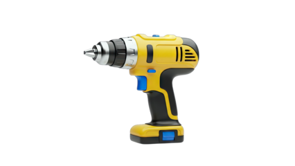 Yellow and black cordless drill with a silver drill bit attached isolated on transparent background