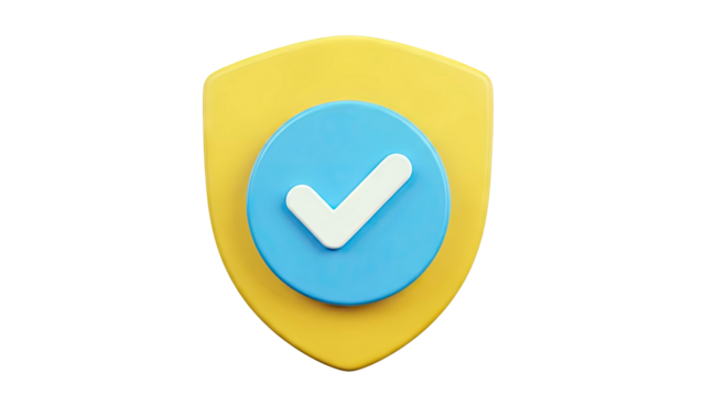 A stylized, 3D lock icon with a green checkmark and a yellow shield, signifying security and verification.  The lock is a vibrant blue, and the shield is a bright yellow