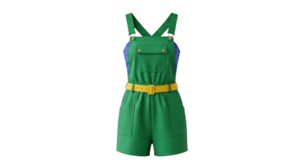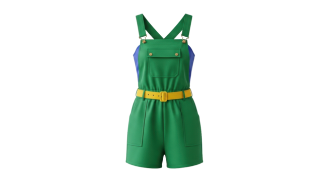 Isolated women's green summer romper, shorts style with a yellow belt; no background