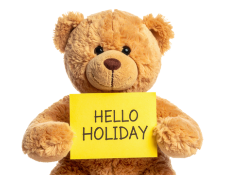 A teddy bear holding a yellow sign that says "HELLO HOLIDAY.