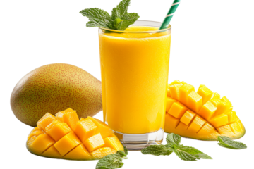 Refreshing mango smoothie in glass garnished with mint sprig and fruit chunks served with a green straw