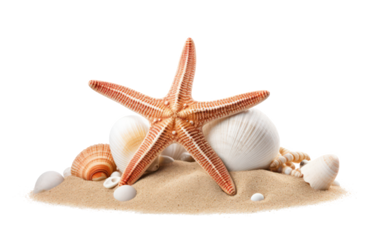 shells and starfish on sand isolated on transparent background
