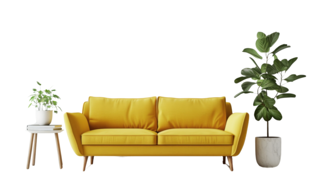 A modern, minimalist yellow sofa with clean lines and wooden legs, isolated on a transparent background