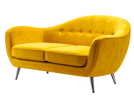 Vibrant yellow sofa with mid-century modern design, isolated on white background.