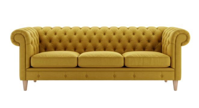 Elegant mustard yellow chesterfield sofa isolated, luxurious velvet couch with tufted upholstery for living room furniture