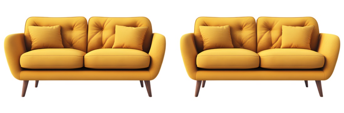 A striking set of yellow sofas, creating a bold and contemporary statement in a modern living space. Transparent background.