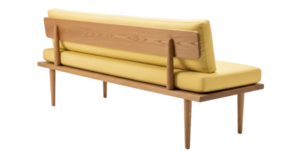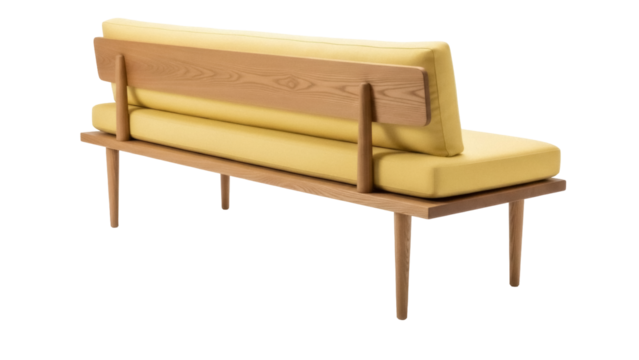 Mid-century modern sofa with mustard yellow upholstery and wooden legs on transparent background
