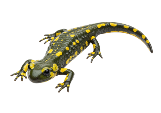 Fire salamander with distinctive black and yellow spots on body and legs on pure white background