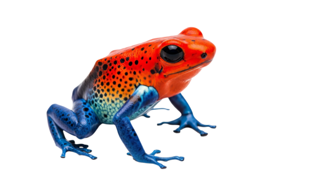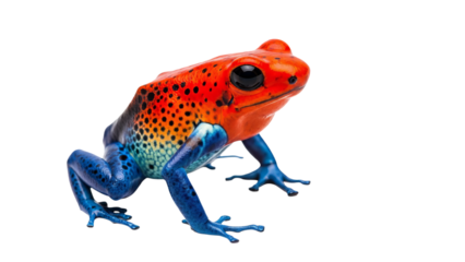 A vibrant red and blue poison dart frog with yellow spots on a clear background.
