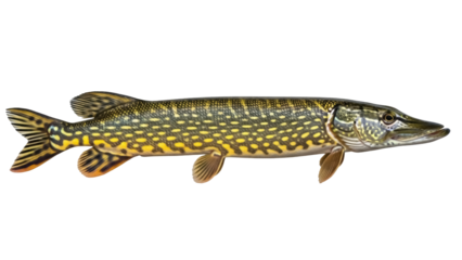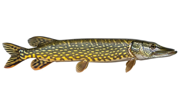 Northern pike fish isolated PNG, freshwater predator with yellow spots on green body, predatory fish for fishing and wildlife concepts
